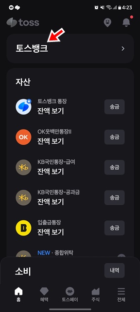 실행된 토스 앱 홈에서 상단에 있는 토스뱅크를 선택 합니다.