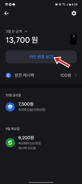 이동된 내 카드 세부 내용 화면에서 큼지막하게 있는 카드 번호 보기 버튼을 선택 합니다.