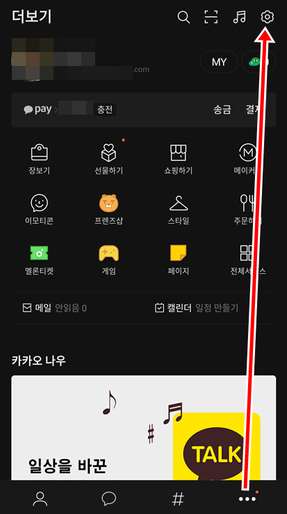 ▼ 설정 방법은 카카오톡 하단 [더보기 > 설정] 으로 이동을 합니다.