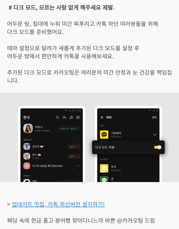 개인적인 바람으로는 카카오톡 PC 버전도 다크 모드를 기본으로 지원해 주었으면 좋겠네요. PC 버전은 테마 자체를 지원하지 않아 바꿀 수가 없는데, 기본으로 다크 모드를 지원해 주면 사용 하는데 좀더 좋을거 같습니다.
