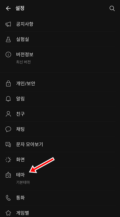 ▼ 설정 화면에서 중간쯤에 있는 [테마] 를 선택 합니다.