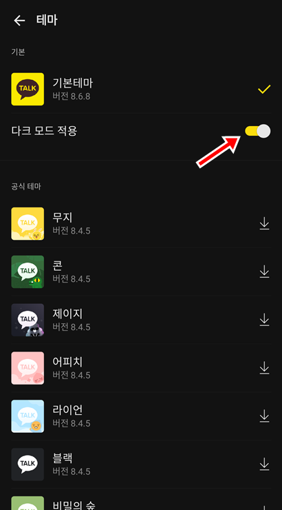 테마를 설치할 필요도 없고 간단한 카카오톡 설정만으로 다크 모드를 사용할 수 있습니다.