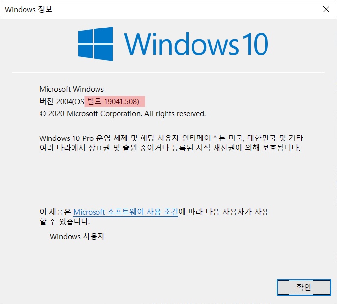 1. Win + R 을 누르고 winver 입력 후 윈도우 빌드 버전이 19041.423 이상인걸 확인 합니다.