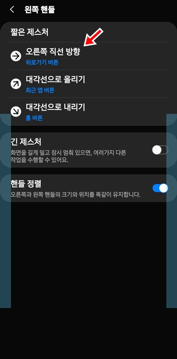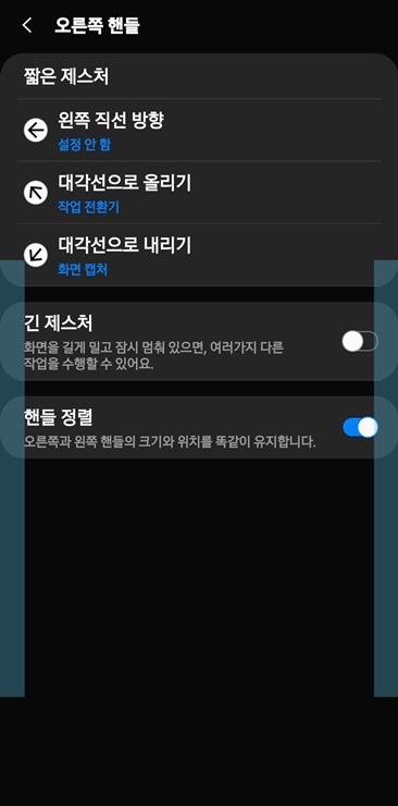▲ 제일 상단의 "사용중" 을 켜주고 아래에 각각의 동작에 대한 설정을 해주면 됩니다. 저 같은 경우 스마트폰을 사용할때 왼손을 주로 사용하기 때문에 왼쪽 핸들에 뒤로가기 기능을 넣어 두었습니다.