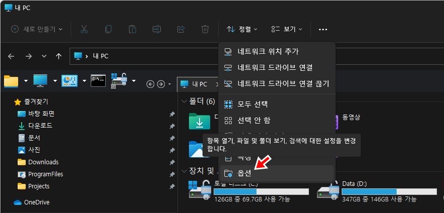 윈도우 탐색기에서 상단 메뉴에서 점세개 버튼을 누른후 옵션을 누릅니다.