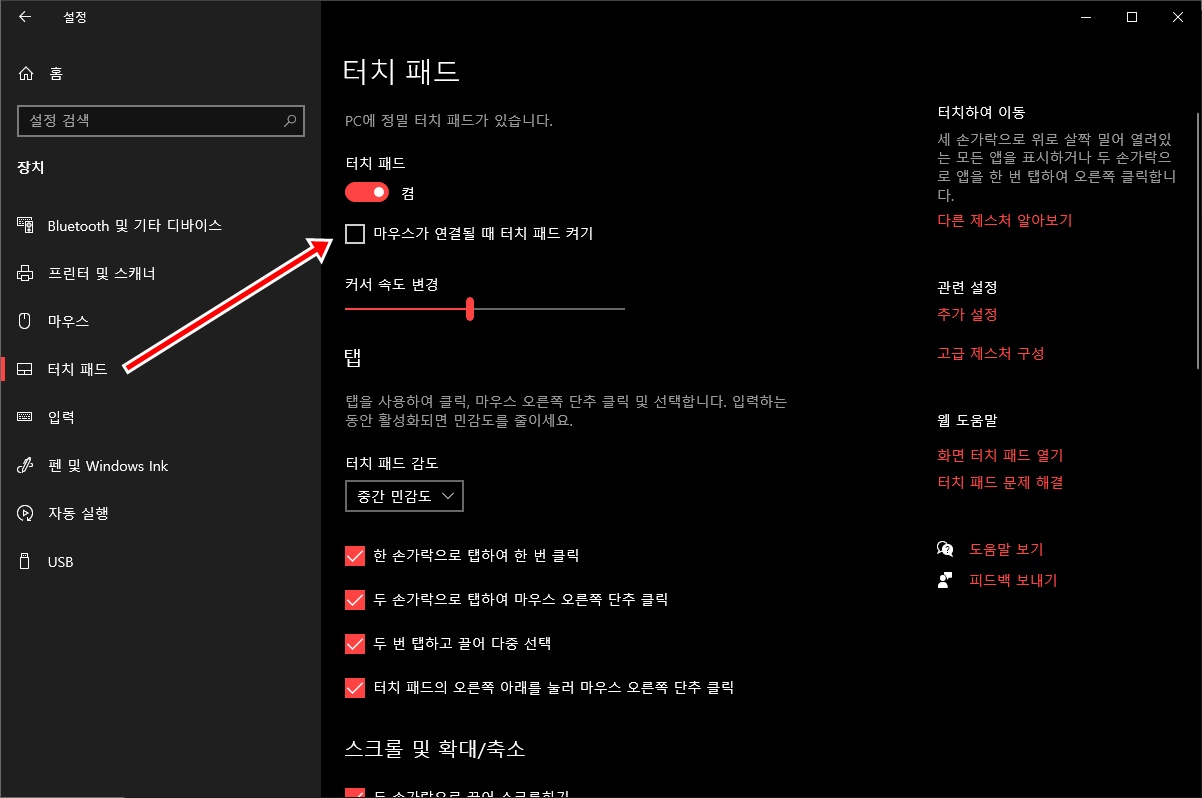 터치패드 항목의 상단에서 [마우스가 연결될 때 터치패드 켜기] 항목의 체크를 해제 하면 됩니다.
